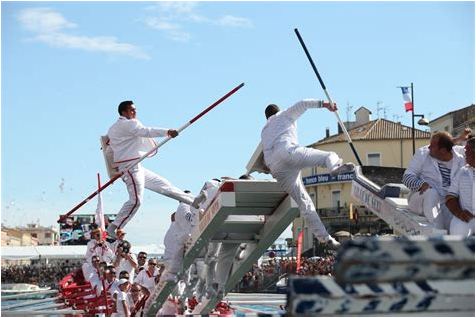 Il s’agit d’un combat « chevaleresque » entre deux jouteurs se défiant sur une tintaine (sorte d’échelle fixée en porte à faux sur l’arrière d’une barque). Les jouteurs viennent de l’ensemble des agglomérations autour du bassin de Thau (et un peu au delà : Palavas).